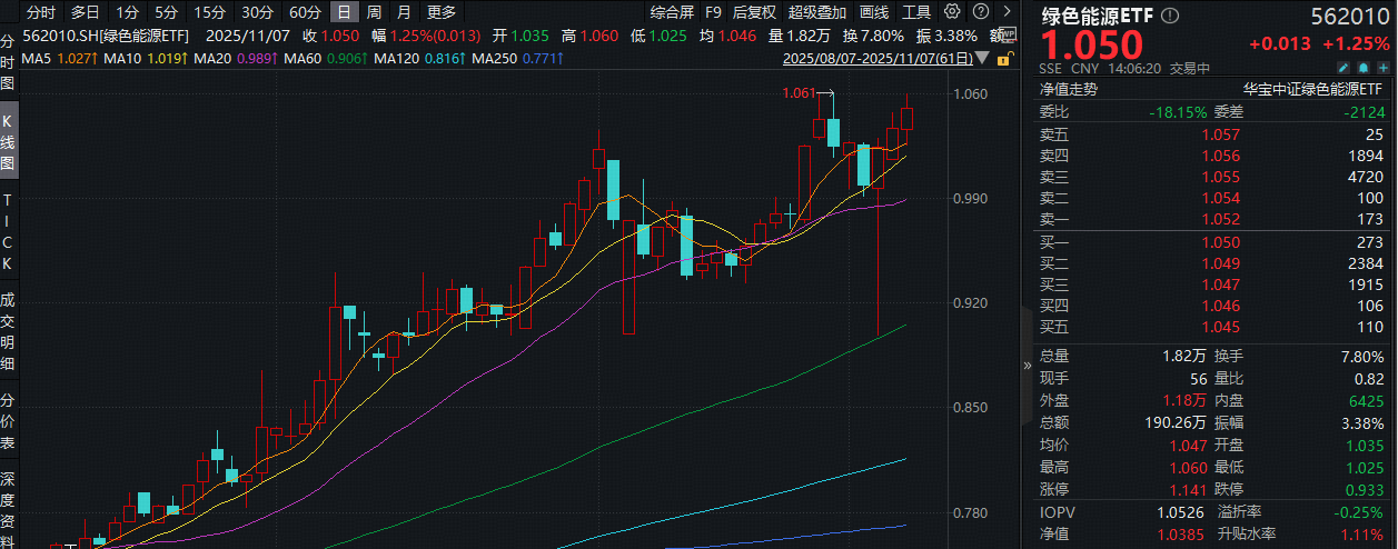 11月7日,电池板块午后持续爆发,上游材料方向领涨,全市场唯一一只跟踪绿色能源指数的绿色能源ETF(562010)场内涨幅盘中上探2.22%,现涨1.25%,站上全部均线,冲击日线3连涨!成份股方面