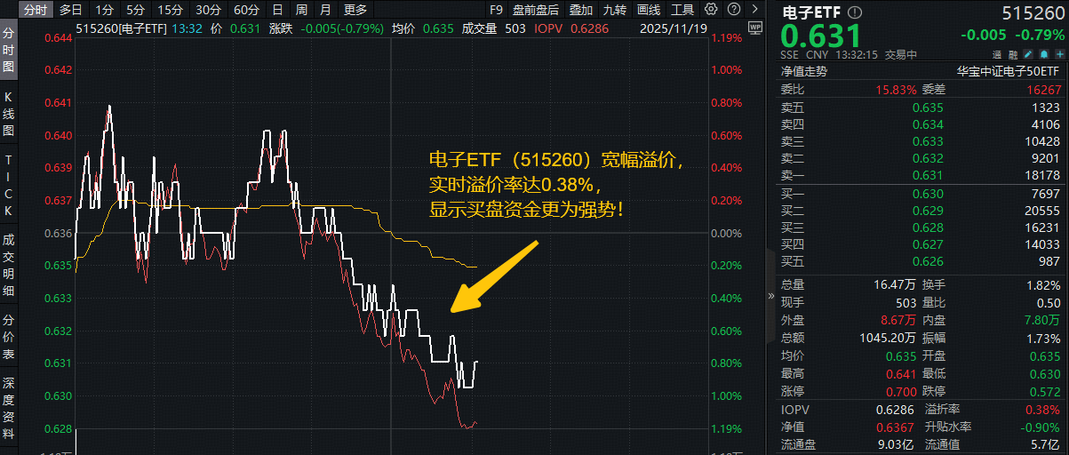 11月19日午后,果链含量44%的电子ETF(515260)随市回调,场内价格现跌0.79%,值得关注的是,该ETF场内宽幅溢价,实时溢价率高达0.38%,显示买盘资金更为强势,或有资金逢跌抢筹!成