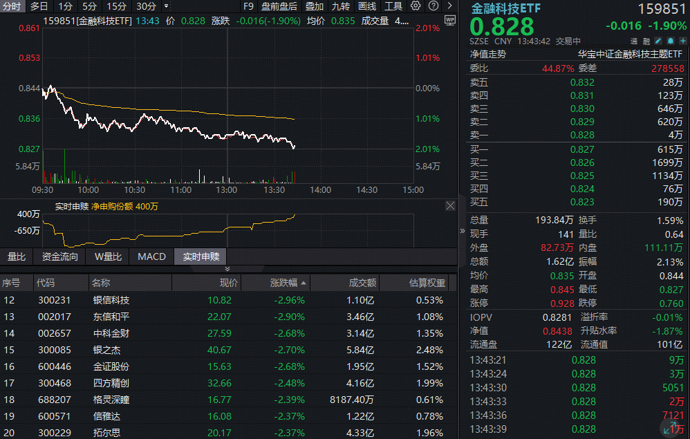 11月19日,金融科技震荡磨底,仅数字认证、税友股份、星环科技等三股飘红,其余个股普跌。其中,神州信息逼近跌停,高伟达、格尔软件、润和软件等跌超3%。百亿金融科技ETF(159851)场内跌近2%,