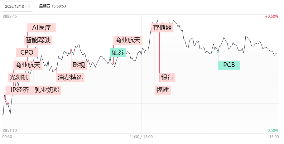 12月18日,A股三大股指走势分化,沪指低开高走高位震荡,深成指及创业板指低开小幅回升后震荡走低,截止收盘,沪指涨0.16%报3876.37点,深成指跌1.29%报13053.97点,创业板指跌2.