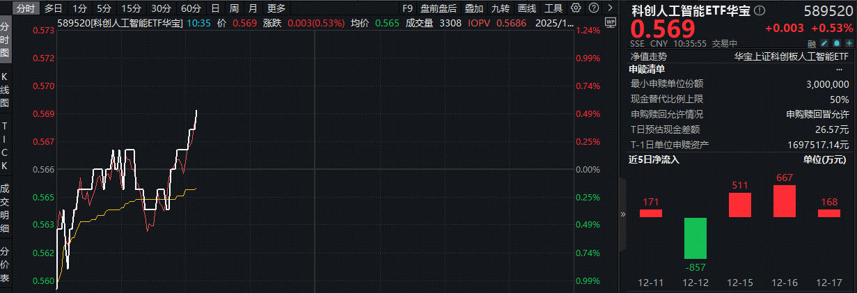 今日(12月18日)字节产业链含量超33%的科创人工智能ETF(589520)逆市活跃,场内价格现涨0.53%,上交所数据显示,该ETF此前3日连续获资金净流入,合计金额1346万元,反映资金看好国