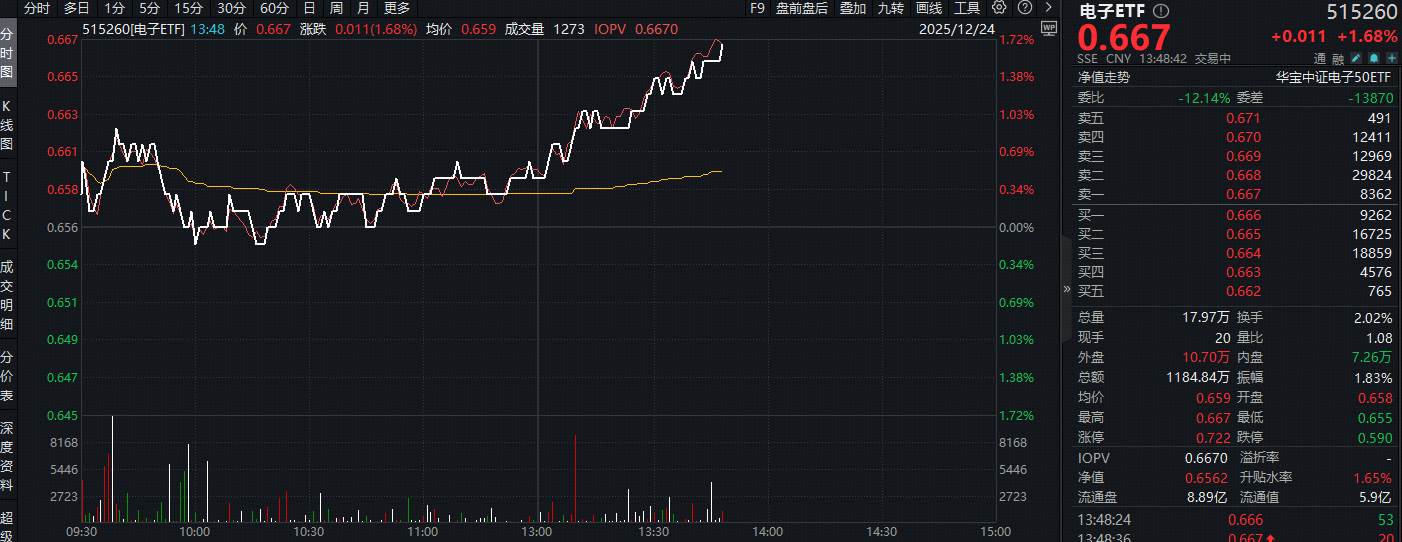 12月24日,超211亿主力资金涌入电子板块,板块吸金额高居31个申万一级行业首位!热门ETF方面,汇聚电子板块核心龙头的电子ETF(515260)午后震荡走高,场内价格现涨1.68%,盘中收复60