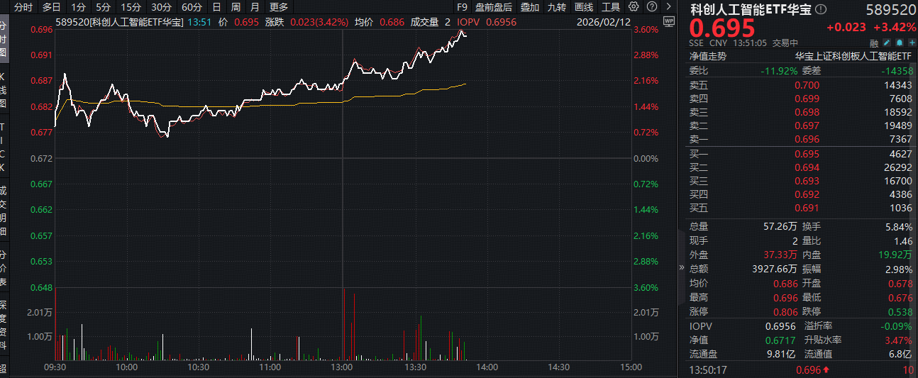 2月12日午后,字节跳动产业链权重占比超29%的科创人工智能ETF华宝(589520)继续拉升,场内涨幅盘中上探3.57%,现涨3.42%,盘中收复20日均线,截至当前,已收复全部均线。成份股方面,