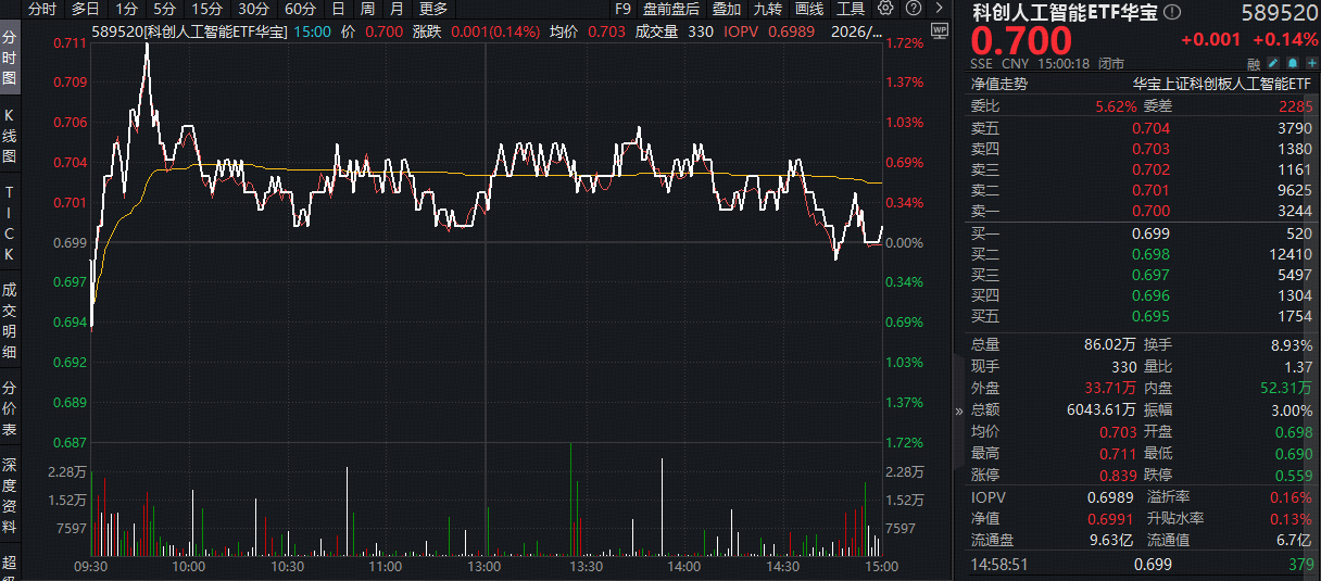 无惧美股科技股行情波动,2月13日,重点布局国产AI产业链的科创人工智能ETF(589520)场内涨幅早盘上探1.72%,后虽被大盘拖累,但仍逆市收涨0.14%,全天成交额6043万元,环比小幅放量