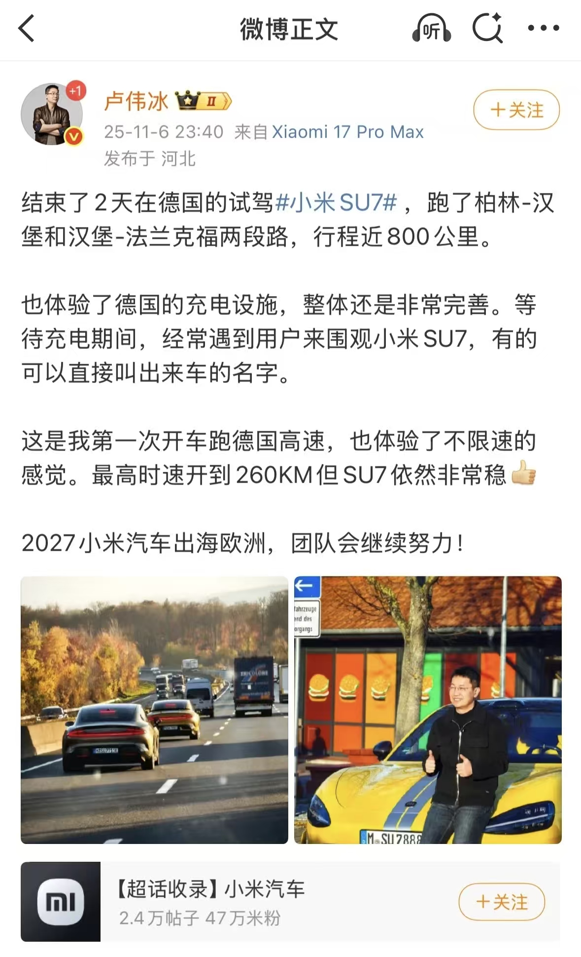 11月6日,小米集团总裁卢伟冰发微博称,自己结束了2天在德国的小米SU7试驾,行程近800公里,旗舰还体验了德国的充电设施,整体非常完善,小米SU7还经常遇到用户围观。卢伟冰表示,“这是我第一次开车
