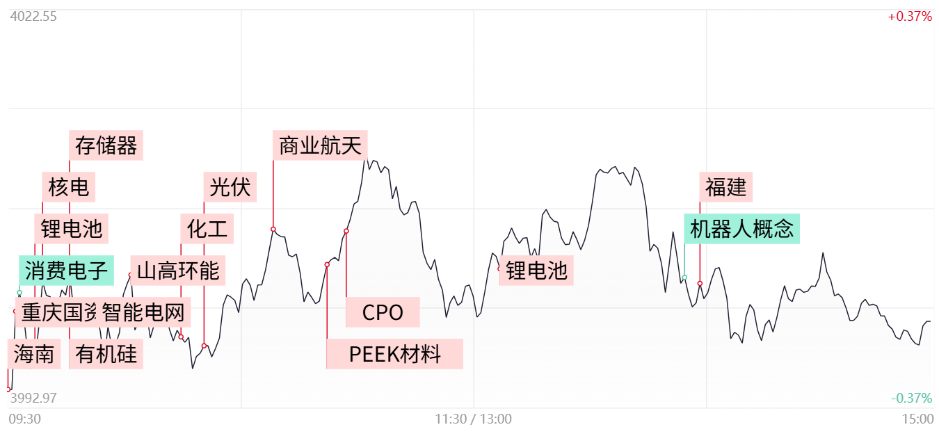 A股三大指数今日集体小幅回调,沪指失守4000点大关。截至收盘,沪指跌0.25%,深证成指跌0.36%,创业板指跌0.51%。沪深两市全天成交额不足2万亿元,较昨日缩量562亿元。盘面上,电解液价格