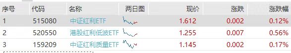 11月19日,红利资产再度崛起。截至10时45分,港股红利低波ETF(520550)、中证红利质量ETF(159209)及中证红利ETF(515080)分别涨0.56%、0.17%及0.12%。市场