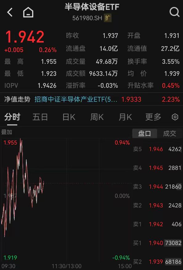 11月19日盘面波动加大,三大指数跳水后迅速翻红,多板块于水面附近震荡。半导体设备ETF(561980)盘中一度拉涨0.88%、目前涨0.26%;成份股南大光电涨超4%、神工股份涨超3%,上海新阳、