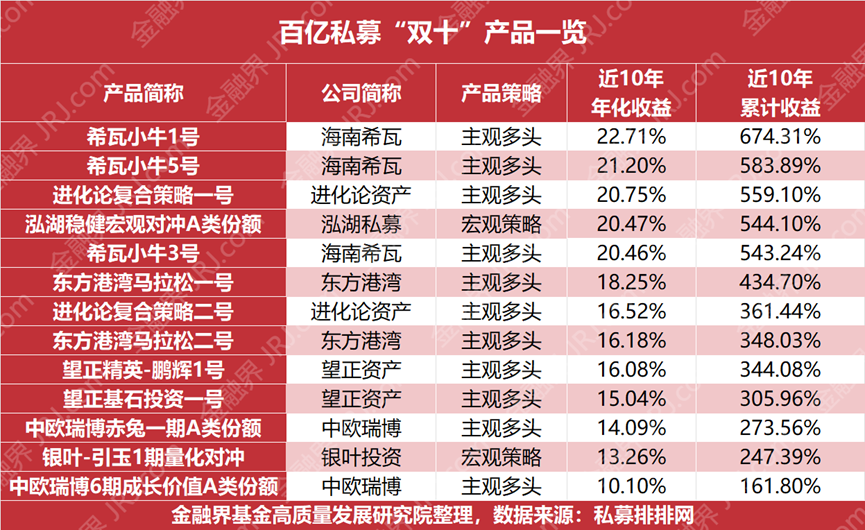 年内私募投资波澜迭起,能穿越牛熊、为投资者创造长期丰厚回报的产品备受关注。私募排排网近期发布的私募基金“长跑英雄榜”,聚焦成立满十年、近十年年化收益超10%的“双十”百亿私募产品。据私募排排网统计显