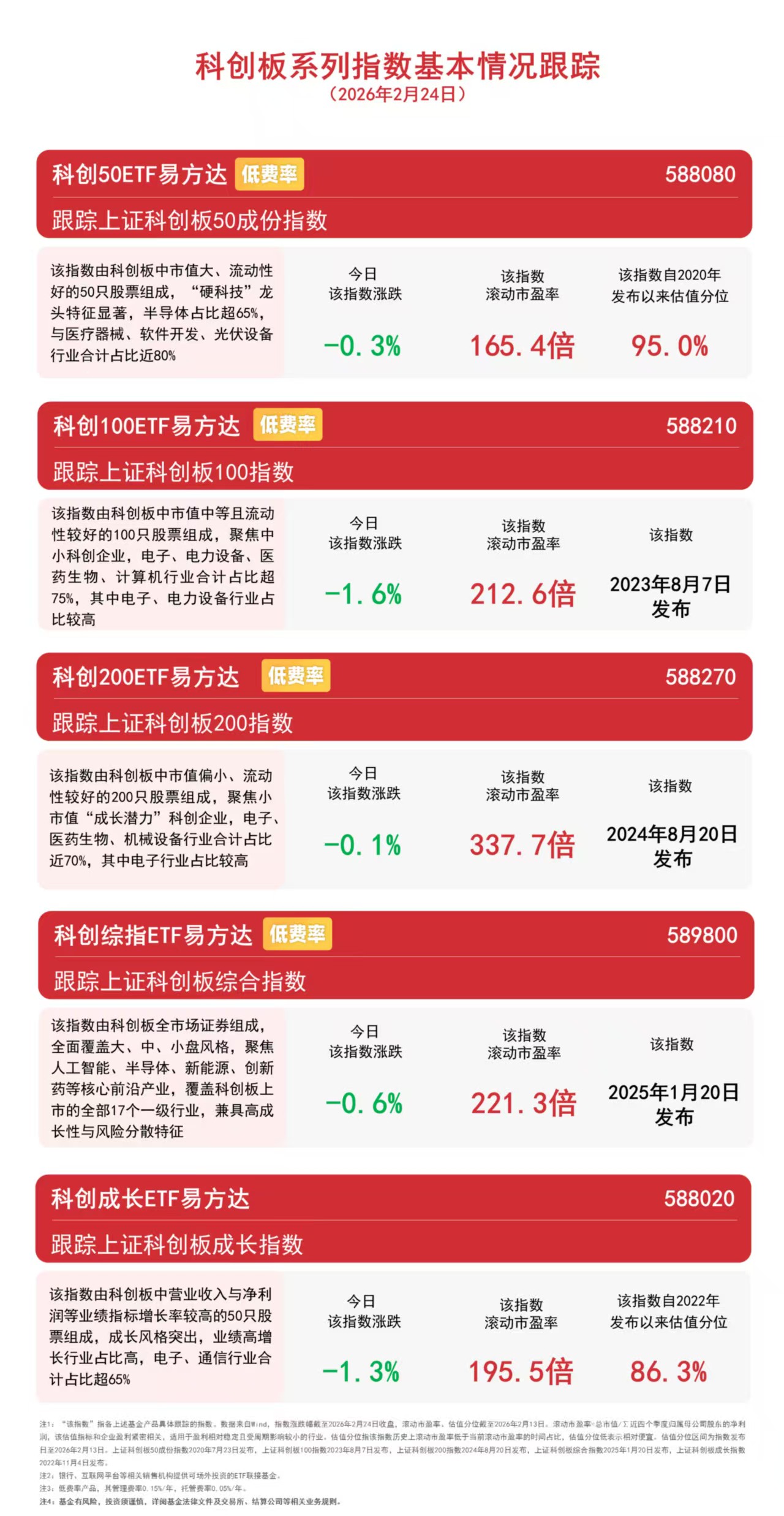2月24日,科技板块走势分化,通信设备走强,软件股集体下跌,半导体板块涨跌互现。指数方面,科创200指数下跌0.1%,科创50指数下跌0.3%,科创综指下跌0.6%,科创成长指数下跌1.3%,科创1