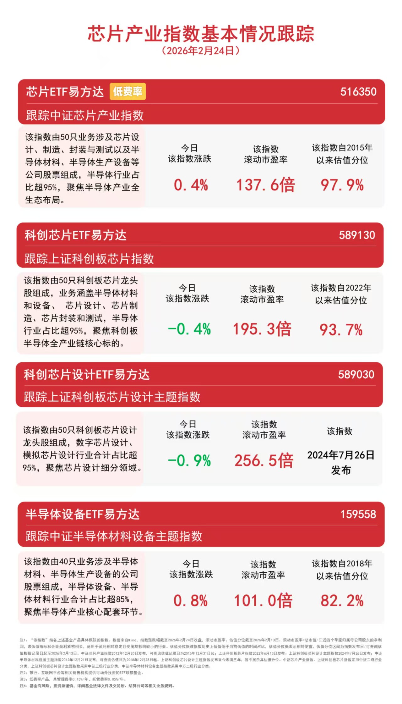 截至收盘,中证半导体材料设备主题指数上涨0.8%,中证芯片产业指数上涨0.4%,上证科创板芯片指数下跌0.4%,上证科创板芯片设计主题指数下跌0.9%。Wind数据显示,半导体设备ETF易方达(15