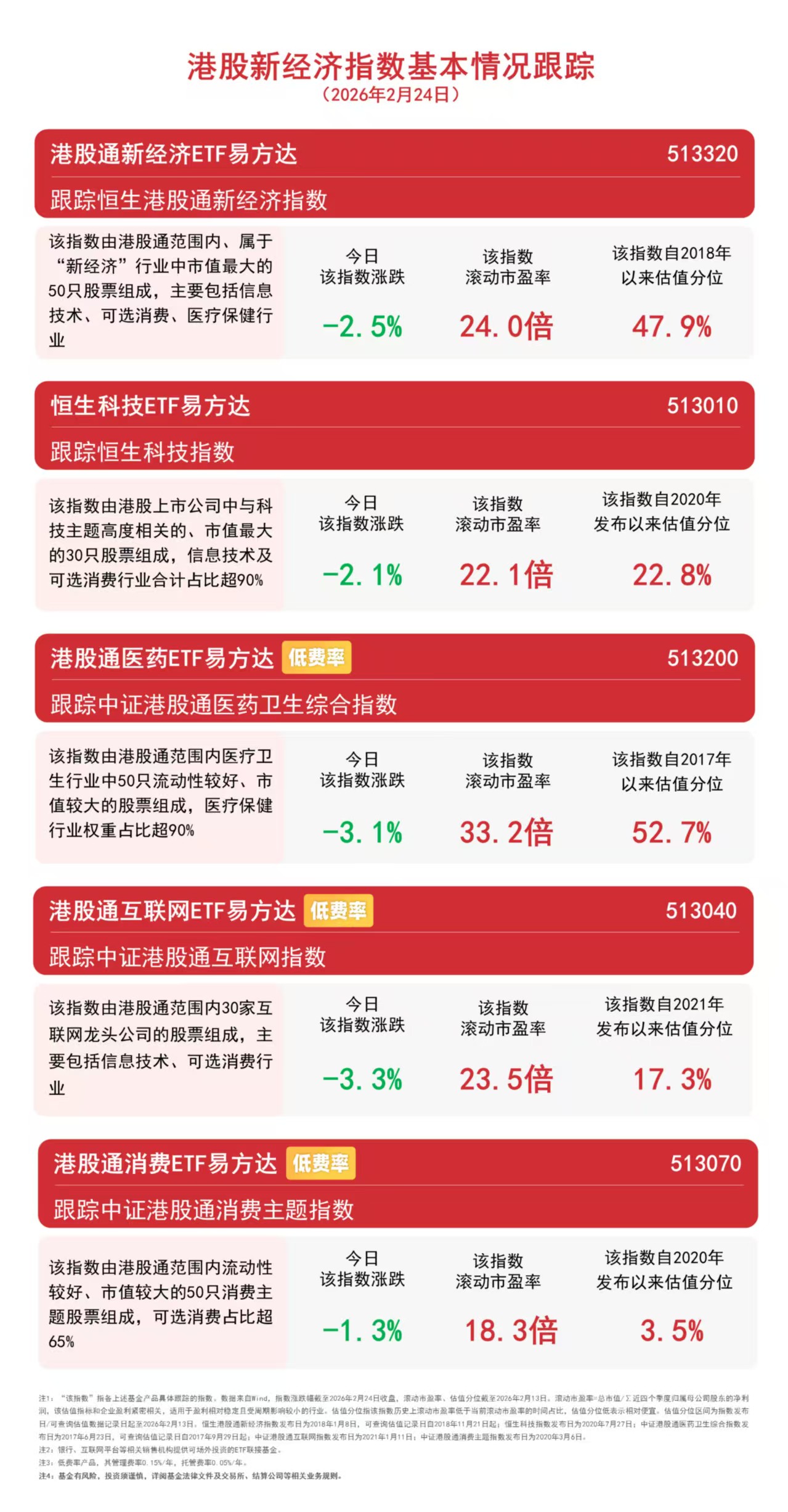 2月24日,港股震荡整理,指数层面,中证港股通消费主题指数下跌1.3%,恒生科技指数下跌2.1%,恒生港股通新经济指数下跌2.5%,中证港股通医药卫生综合指数下跌3.1%,中证港股通互联网指数下跌3