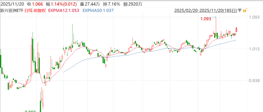 11月20日,印度SENSEX30指数涨0.33%,创2024年9月以来新高,距历史高位仅一步之遥。信实工业、马衡达信息技术、印度国家电网等涨超1%。新兴亚洲ETF(520580)收涨1.14%,报