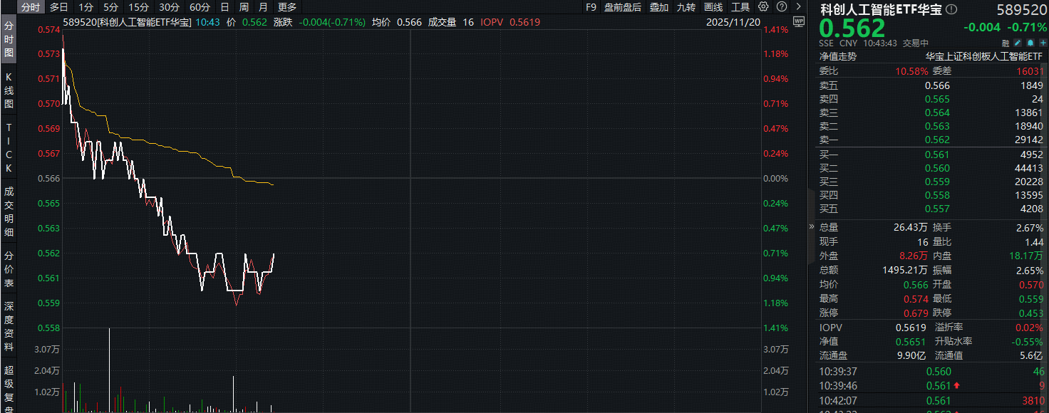 11月20日,A股市场窄幅震荡,通信、建筑材料、银行板块涨幅靠前。截至14点21分,创业板人工智能ETF南方(159382.SZ)涨0.61%,中际旭创涨1.82%。海外方面,英伟达交出远超预期的炸