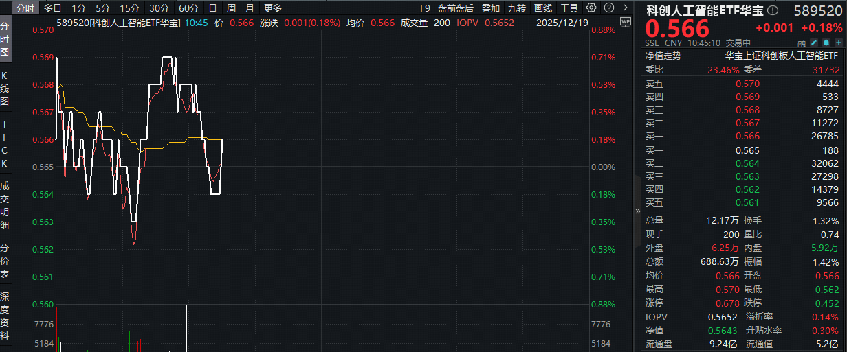 今日(12月19日)早盘,字节产业链含量33%的科创人工智能ETF(589520)在水面附近震荡,场内价格盘中摸高0.71%,现涨0.18%。成份股方面,亚信安全、优刻得涨超2%,晶晨股份、道通科技