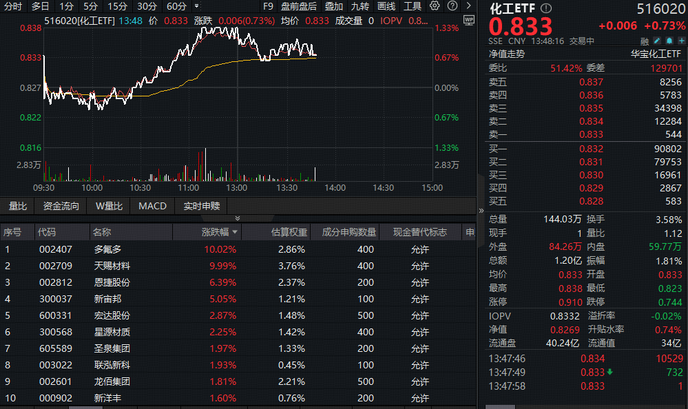 化工板块今日(12月23日)继续猛攻,反映化工板块整体走势的化工ETF(516020)早盘低位震荡后突然拉升,盘中场内价格最高涨幅达到1.33%,截至发稿,涨0.73%。成份股方面,氟化工、锂电等板