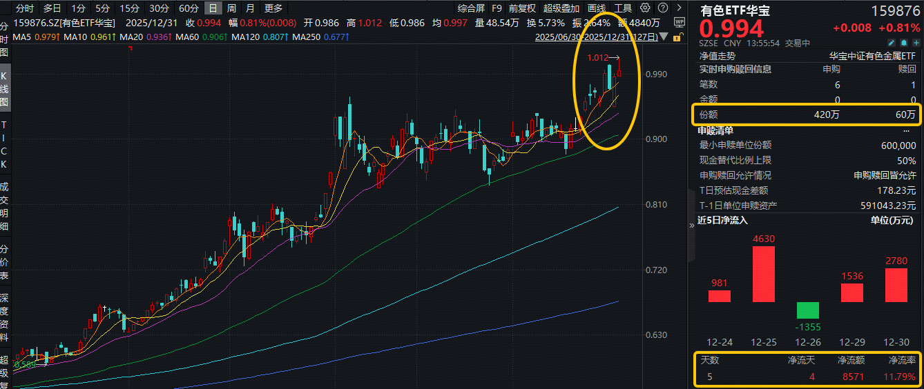 今日(12月31日)揽尽有色金属行业龙头的有色ETF华宝(159876)场内价格盘中涨超2.5%,现涨0.81%,继续刷新上市以来的高点!值得关注的是,截至发稿,有色ETF华宝(159876)获资金