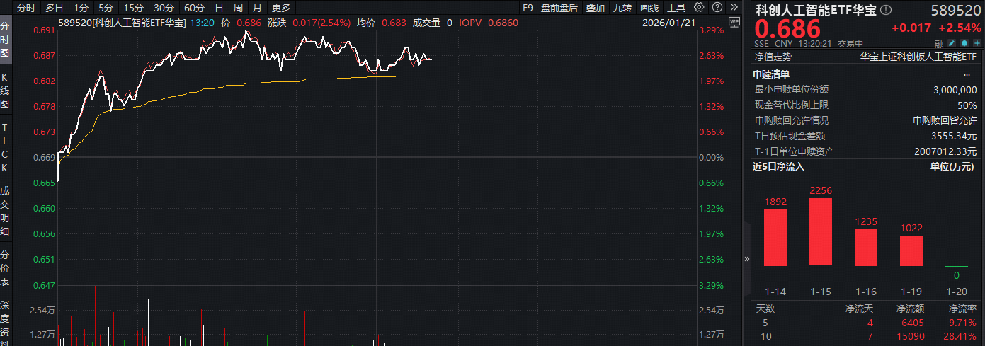 今日(1月21日)重点布局国产AI产业链的科创人工智能ETF华宝(589520)涨势如虹,场内涨幅盘中上探3.29%,现涨2.54%,终结此前的日线4连阴。早有资金进场埋伏!上交所数据显示,科创人工
