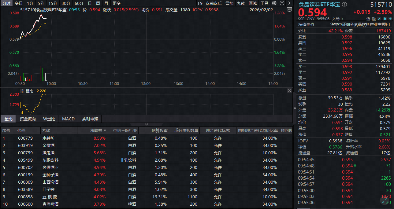 吃喝板块今日(2月2日)再度猛攻,反映吃喝板块整体走势的食品饮料ETF华宝(515710)开盘后直线拉升,盘中场内价格涨幅一度达到3.28%,截至发稿,涨2.59%。成份股方面,白酒集体上扬,截至发