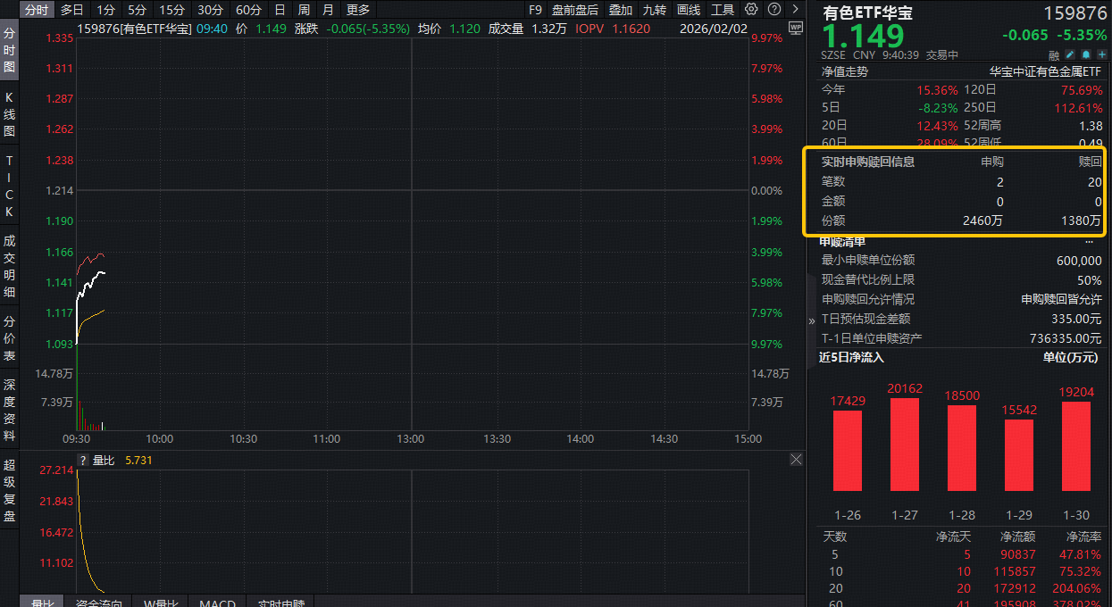 或受金银暴跌扰动,今日(2月2日)有色金属板块延续颓势,有色ETF华宝(159876)开盘场内价格一度跌超7%,现跌5.35%,跌幅略有缩窄。截至发稿,该ETF获资金实时净申购1080万份,或有资金