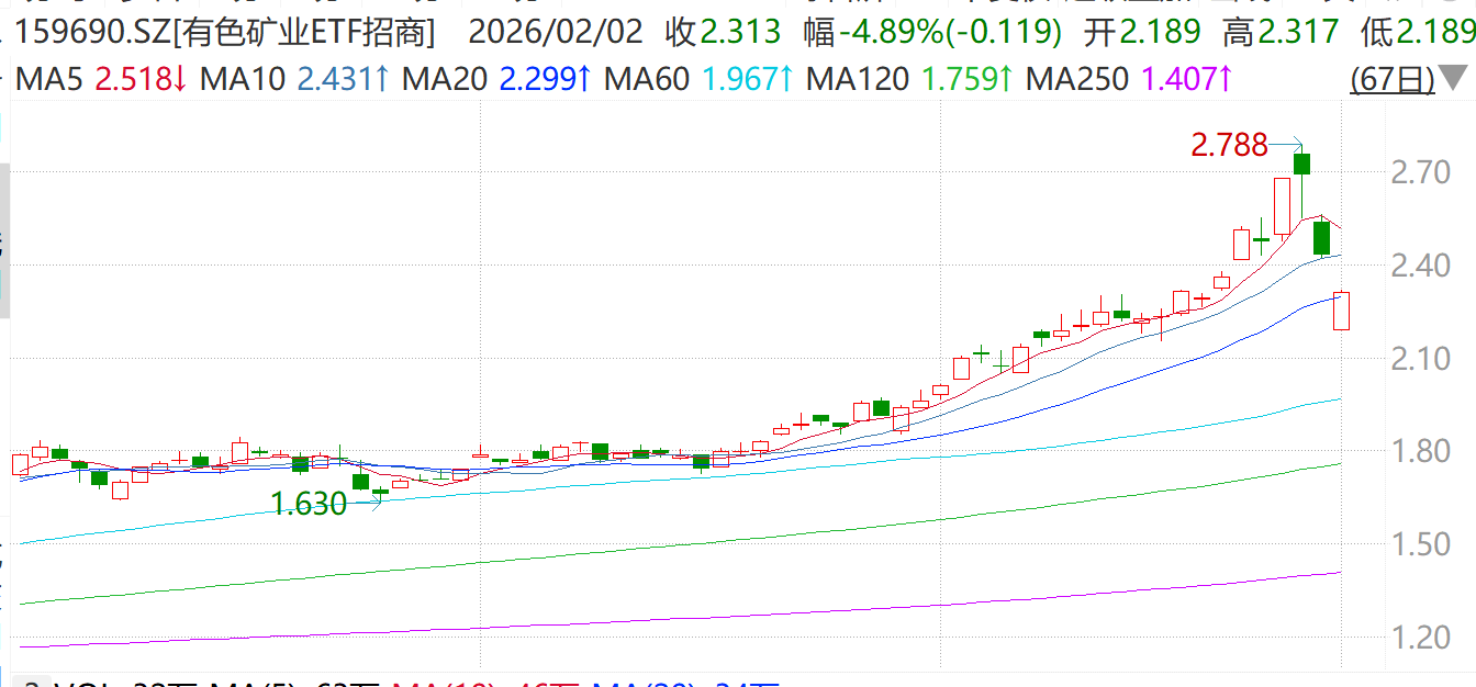 这两天有色板块见证了什么叫从沸点到冰点的骤变。现货黄金单日跌幅创下四十年之最,白银的暴跌更是历史罕见。今天一开盘,有色矿业ETF招商(159690)直接跌停板,但是目前已经回升至-4.9%的跌幅,也