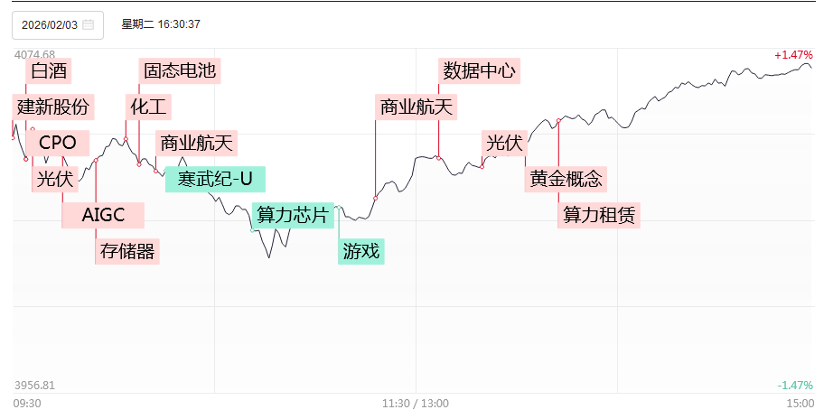 2月3日,市场探底回升,截至收盘,沪指涨1.29%,深成指涨2.19%,创业板指涨1.86%。沪深两市成交额2.54万亿,较上一个交易日缩量405亿。盘面上,市场热点快速轮动,全市场超4800只个股