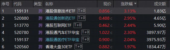 截至收盘,恒生港股通新经济指数上涨2.8%,恒生科技指数上涨2.7%,中证港股通医药卫生综合指数上涨2.6%,中证港股通互联网指数上涨2.3%,中证港股通消费主题指数上涨1.3%。相关ETF受关注,