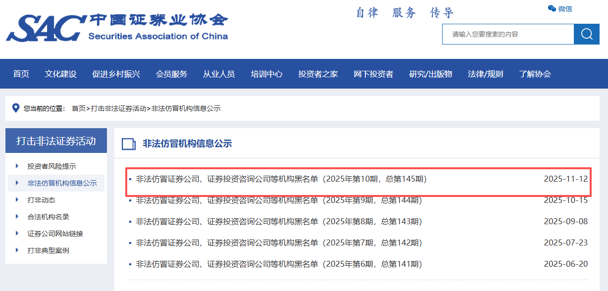 11月12日,中国证券业协会发布了35家非法仿冒证券公司、证券投资咨询公司等机构的黑名单。违规信息表现形式包括非法投资咨询、非法发行证券、非法证券交易以及未取得相关证券期货业务资质的机构发布证券期货