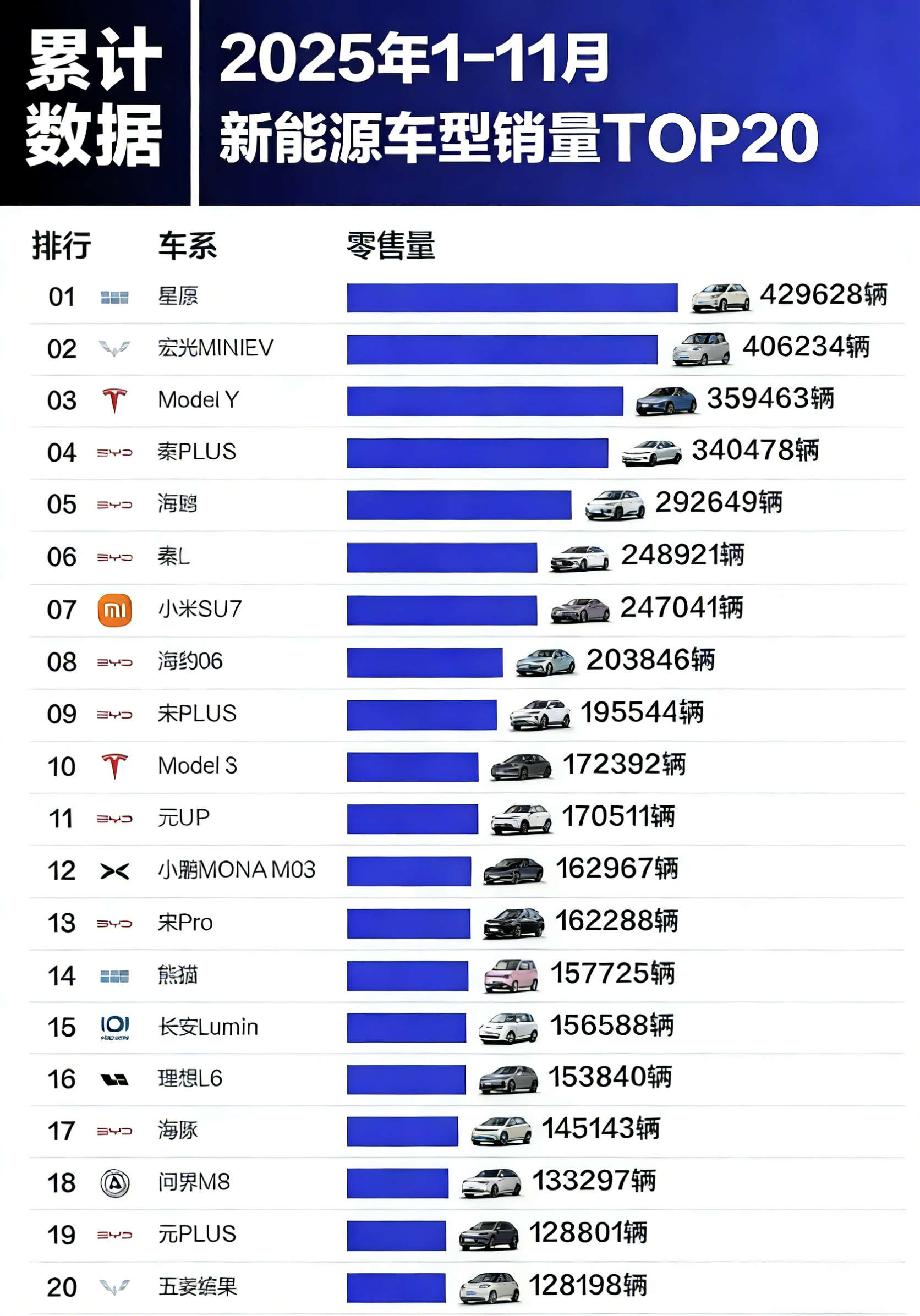 2025年接近尾声,各车型的销量情况也基本上确定,根据乘联分会公布的零售数据,1-11月新能源车销量TOP20也新鲜出炉。从榜单来看,1-11月新能源车销量TOP20基本上是国产品牌的天下,其中吉利