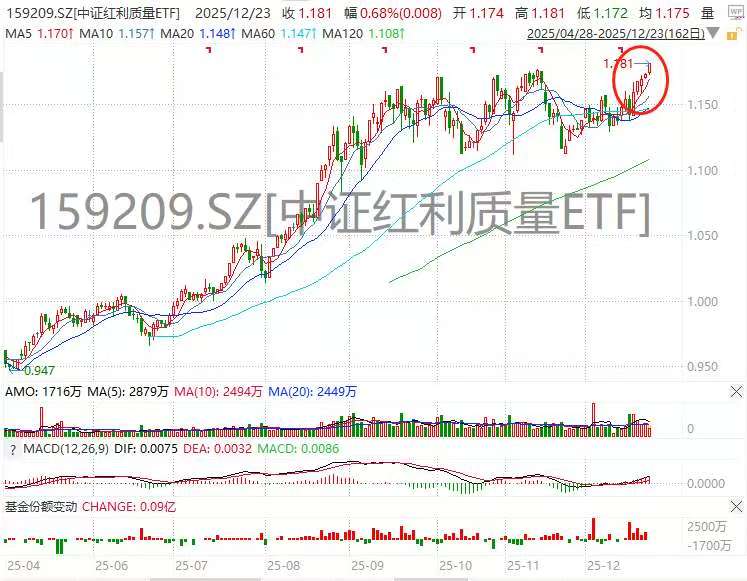 12月23日,数据显示,截至11时21分,“高质量红利”中证红利质量ETF(159209)涨0.68%,盘中冲击五连升冲击历史新高;资金热度不减,据Wind Level2实时行情结合均价预估,盘中净