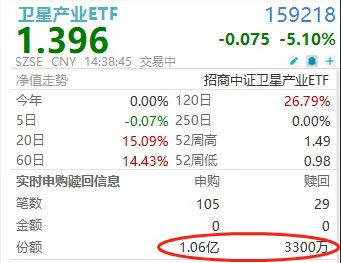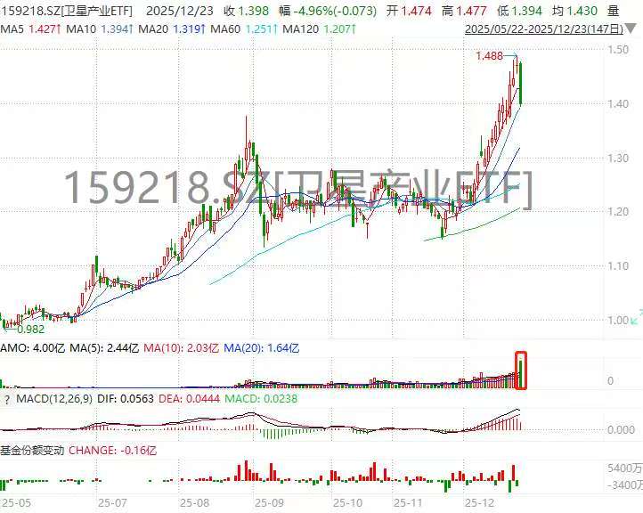 12月23日,延续强势的卫星板块盘中震荡下探。数据显示,截至14时44分,卫星产业ETF(159218)放量跌5.03%,前几大权重股方面,航天电子跌9.71%,中国卫星跌5.36%,中科星图跌4.