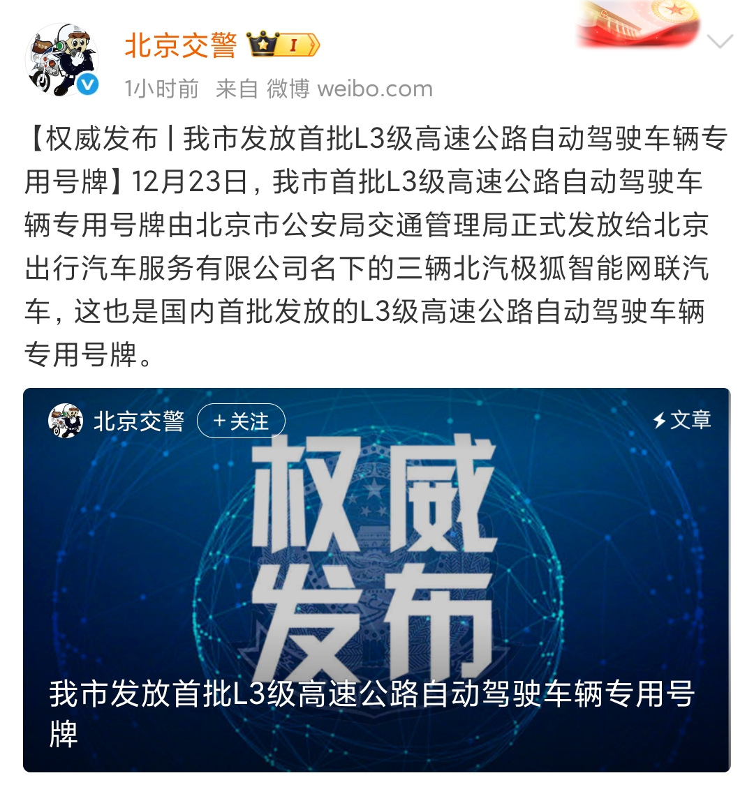 据北京交警官微,12月23日,北京市公安局交通管理局正式向北京出行汽车服务有限公司名下的三辆北汽极狐智能网联汽车发放了北京市首批L3级高速公路自动驾驶车辆专用号牌,这也是国内首批发放的L3级高速公路