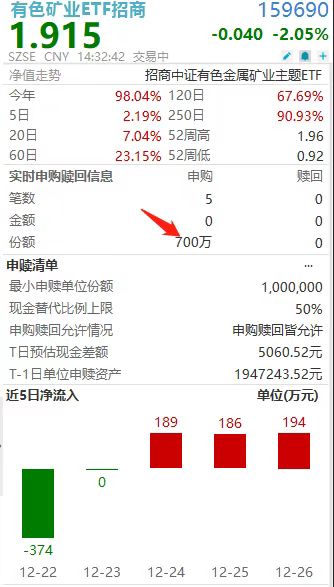 12月29日,数据显示,有色板块午后震荡。截至14时34分,表征板块的有色矿业ETF招商(159690)放量跌2.10%,洛阳钼业、赣锋锂业跌幅居前。资金热度不减,据Wind Level2实时行情结