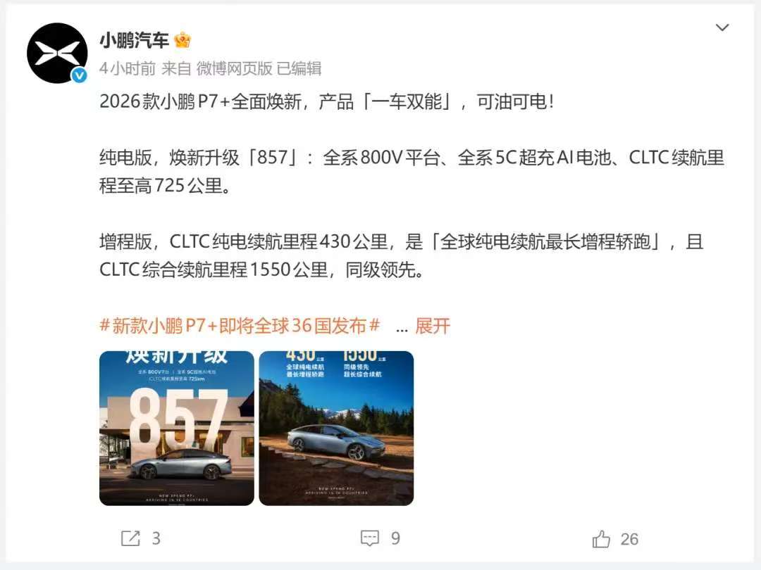12月29日,小鹏汽车官宣2026款小鹏P7+焕新,除了原来就有的纯电版,这次还增加了增程版,小鹏P7+由此成为小鹏汽车旗下第二款增程车型。根据小鹏汽车介绍,小鹏P7+ 增程版是“全球纯电续航最长增