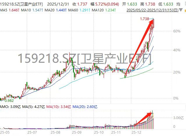 跨年交易日,商业航天板块再度领涨市场。12月31日上午,卫星产业ETF(159218)盘中上涨3.96%,创下年内第33次历史新高;成分股中,北斗星通与长江通信强势涨停。板块热度持续高企,市场讨论度