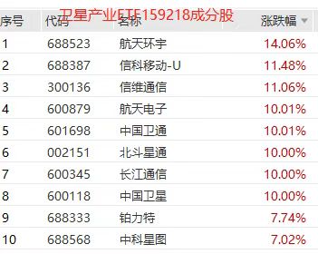 12月31日,数据显示,截至14时27分,表征板块的卫星产业ETF(159218)涨7.06%,成分股航天环宇、国博电子、信维通信近十只成分股涨超10%。交投持续升温,成交额超4.1亿。分析指出,在