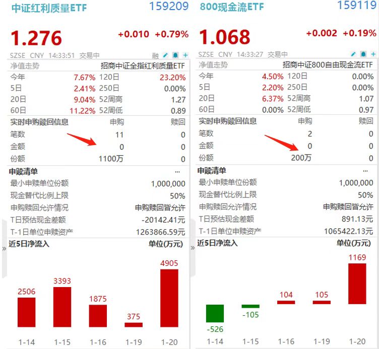 1月21日,两市午后震荡盘整。截至14时32分,中证红利质量ETF(159209)、800现金流ETF(159119)分别涨0.79%、0.19%,一度分别涨1.18%、0.66%。盘中双双录得净流