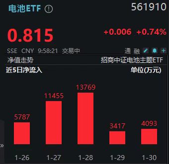 2月2日,电池板块在政策与产业双重利好刺激下放量上攻。截至9时57分,表征板块的电池ETF(561910)上涨0.7%,成交活跃。成分股中,鹏辉能源、天华新能、南网储能、上能电气等涨幅居前。分析指出