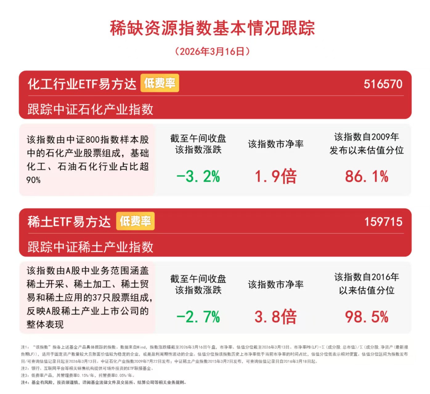 截至收盘,中证稀土产业指数下跌2.2%,中证石化产业指数下跌3.1%。Wind数据显示,化工行业ETF易方达(516570,联接基金A/C:020104/020105)最新规模近30亿元,位居同标的