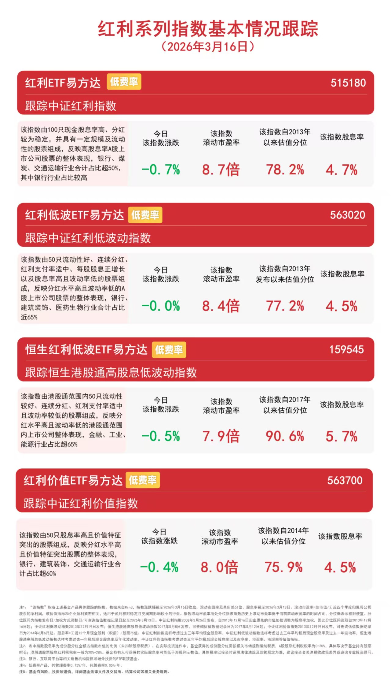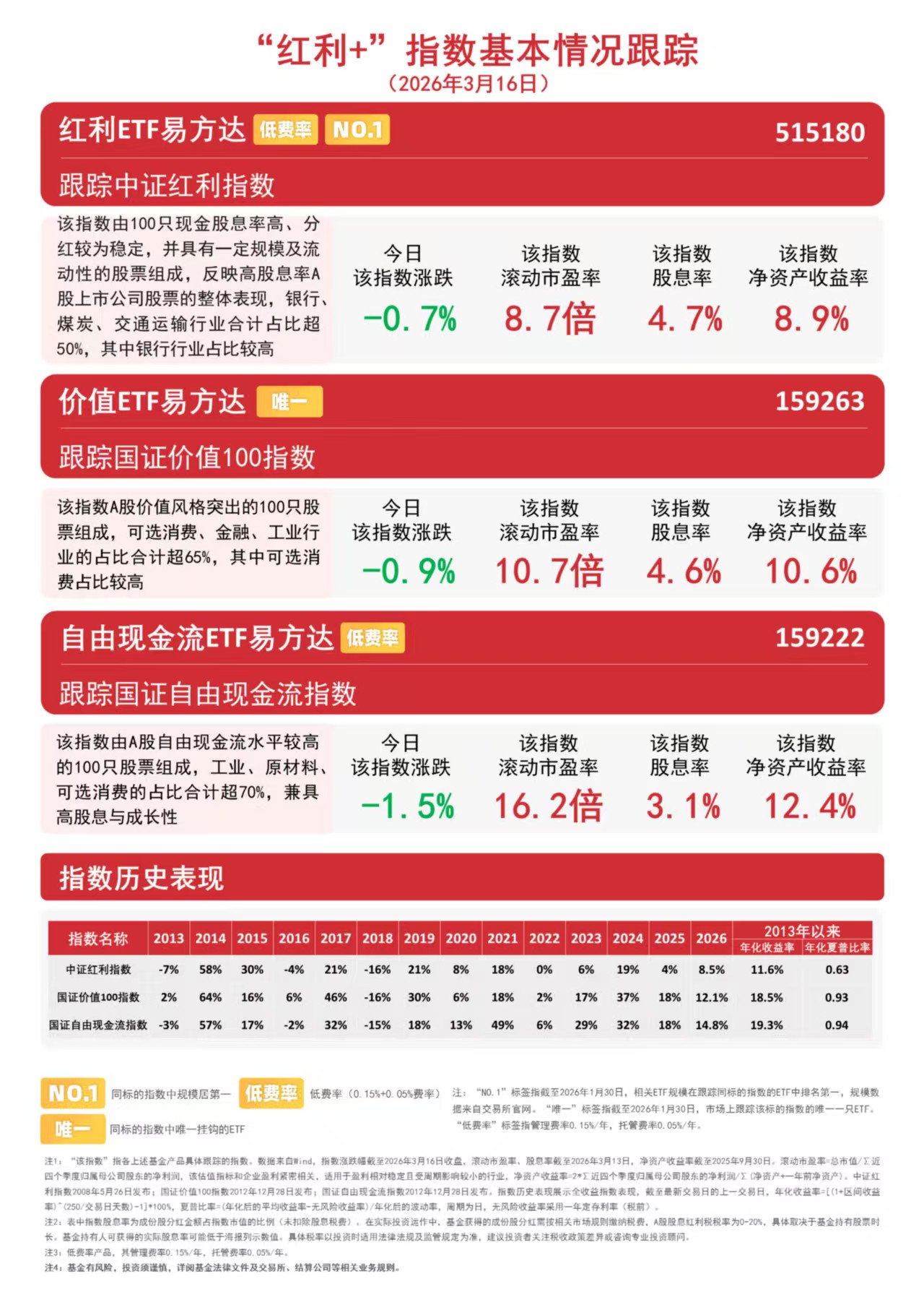 3月16日,大盘震荡分化,科技方向午后回暖,前期涨幅较多的资源类板块回调,“红利+”指数集体调整。截至收盘,中证红利指数下跌0.7%,国证价值100指数下跌0.9%,国证自由现金流指数下跌1.5%,