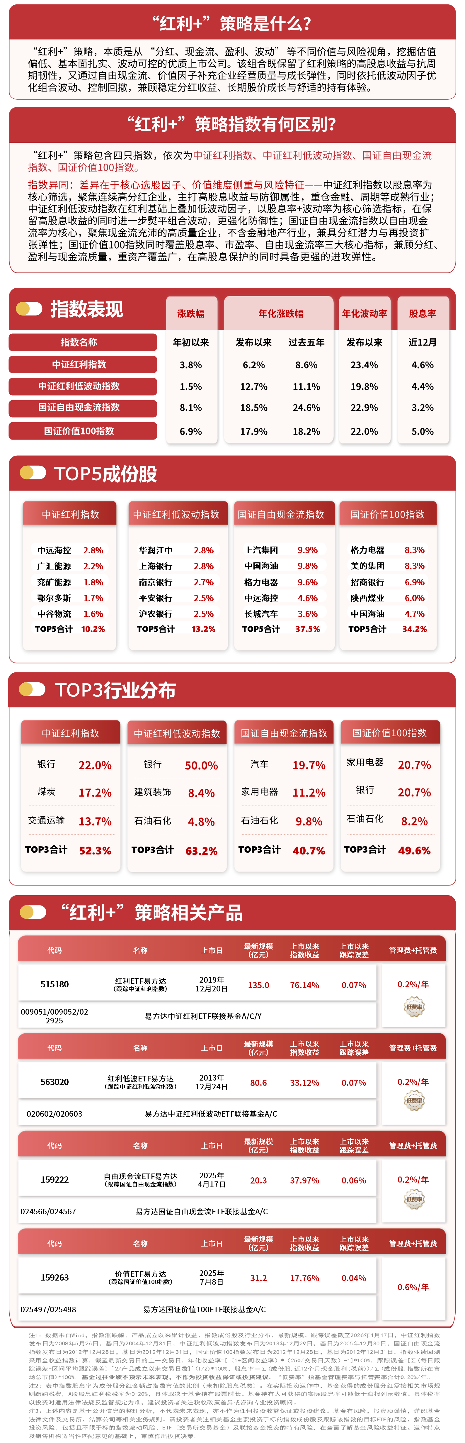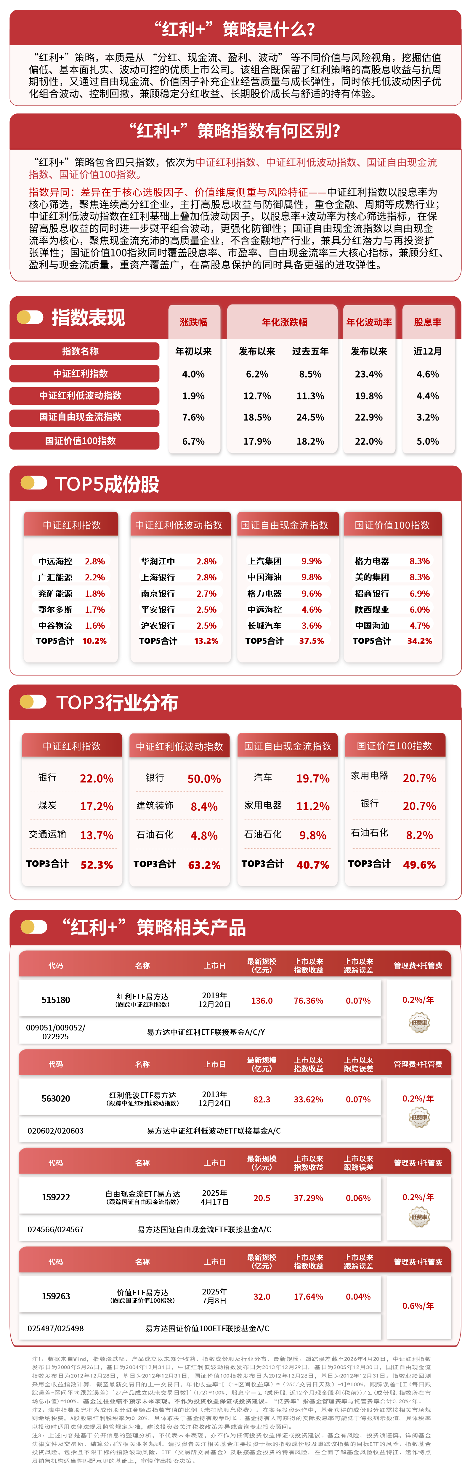 4月20日,大盘震荡上行,“红利+”策略指数走势分化,截至收盘,中证红利低波动指数上涨0.4%,中证红利指数上涨0.1%,国证价值100指数下跌0.1%,国证自由现金流指数下跌0.5%,价值ETF易