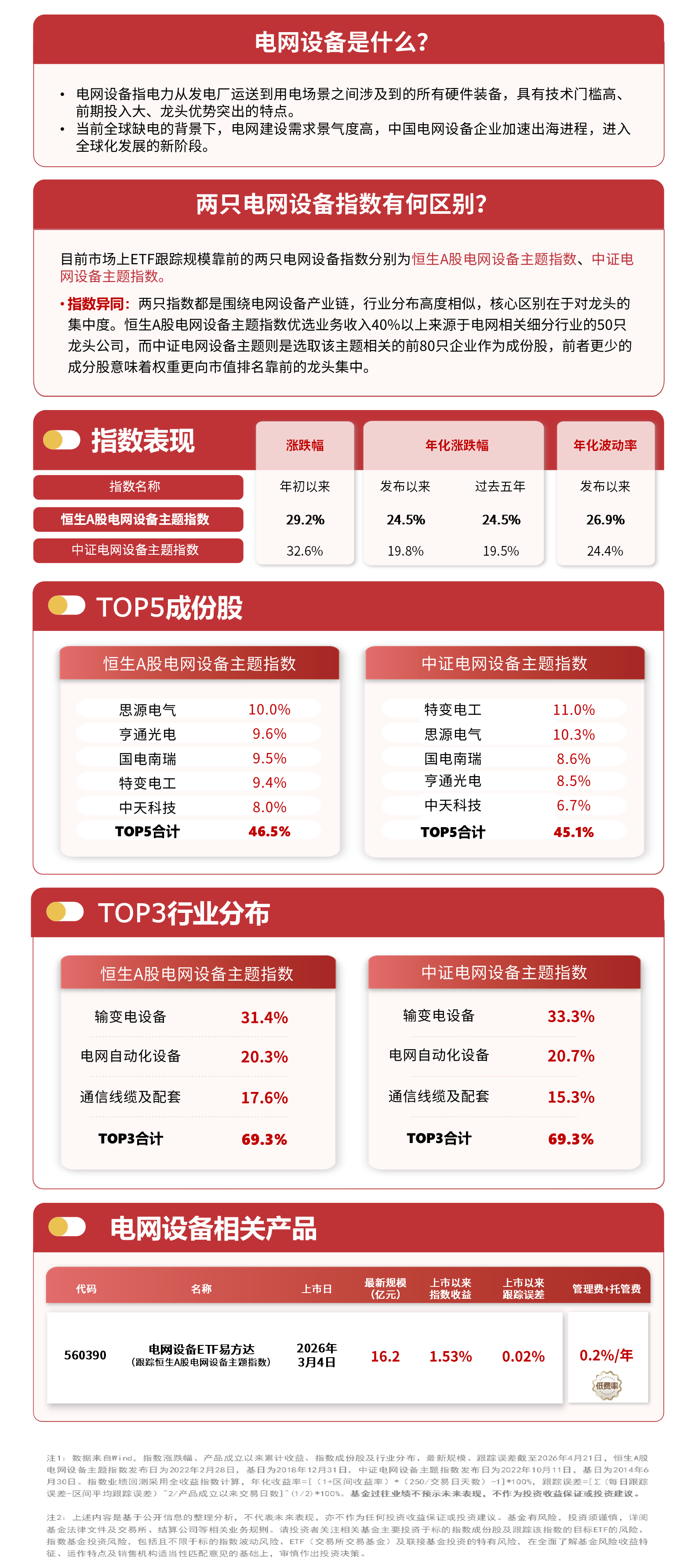 截至收盘,恒生A股电网设备指数下跌0.5%,指数成份股涨跌互现,浙江荣泰涨超5%,中天科技、起帆电缆涨超4%,汉缆股份、科泰电源跌逾3%。财通证券研报显示,2026年一季度电网投资总额已超1600亿