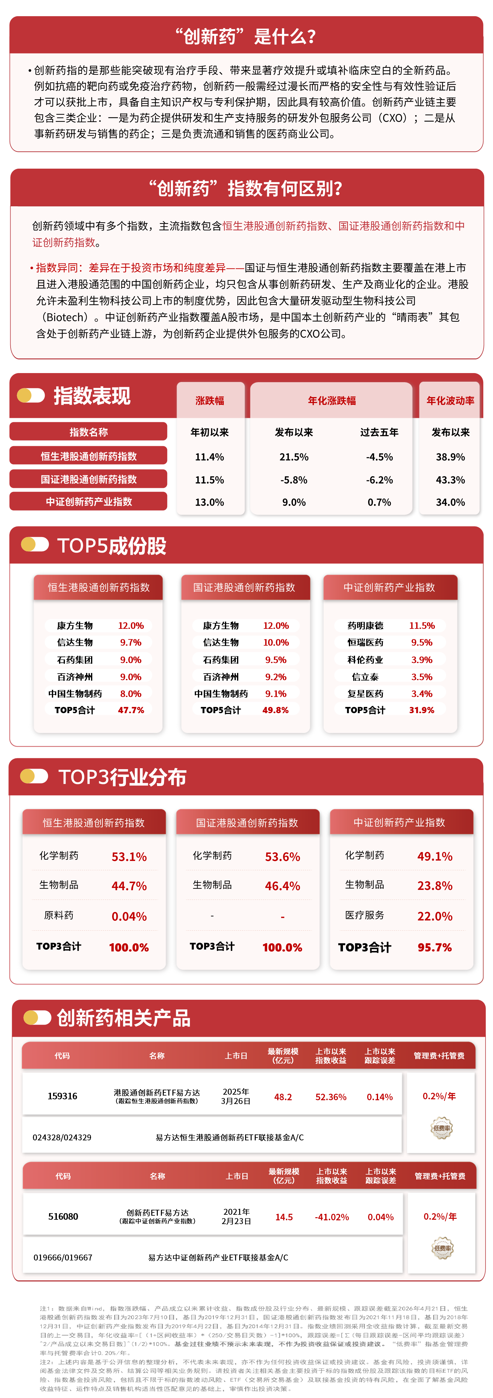 4月21日,创新药赛道短线承压,截至收盘,恒生港股通创新药指数下跌0.9%,中证创新药产业指数下跌1.2%。Wind数据显示,港股通创新药ETF易方达(159316,联接基金A/C:024328/0