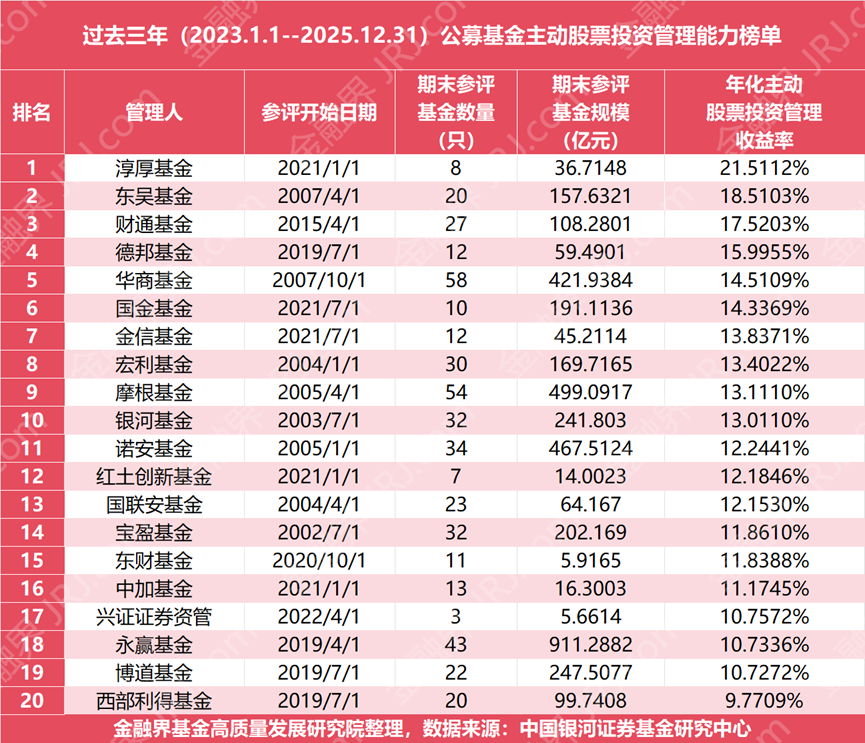 中国银河证券基金研究中心发布的《公募基金长期主动股票投资管理能力榜单》,以近三年、近十年双时间维度数据,清晰勾勒出公募行业主动权益投资的竞争格局:大型老牌基金公司凭借深厚投研积淀与多元布局彰显业绩持