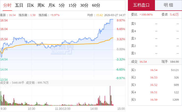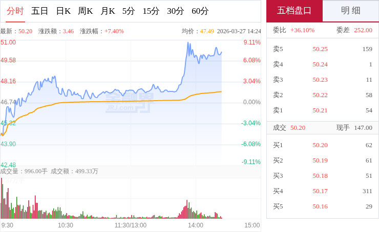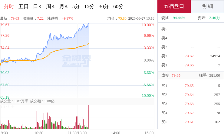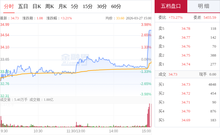 交易所数据显示,3月27日,西部材料开盘后持续震荡走高,早盘阶段交投活跃、放量上攻,做多动能充足,随后在相对高位维持震荡整理走势,盘中波动幅度较大,大部分时间运行在均价线上方,整体走势偏强,上攻之后