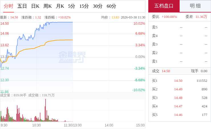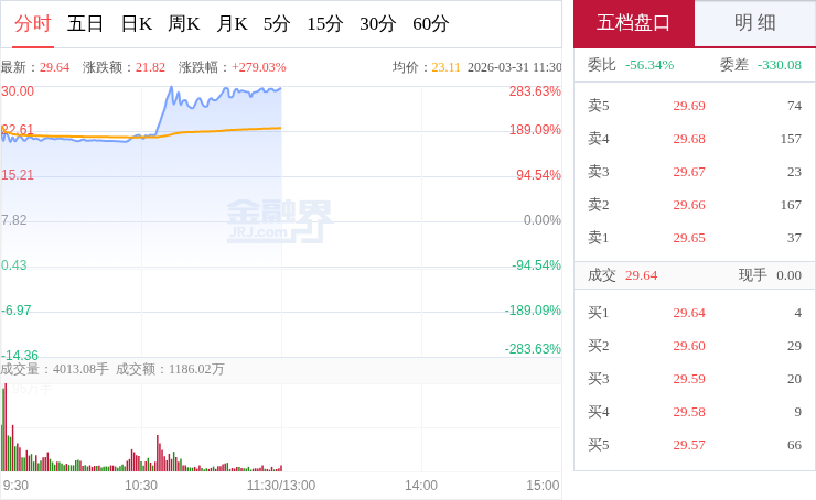 交易所数据显示,3月30日,再升科技开盘后短暂下探,随后整体呈现震荡上行的走势,期间量能配合良好,大部分时间在均价线上方运行,下探后市场承接力度充足,后续上攻动能充沛。再升科技专注节能洁净领域,打造